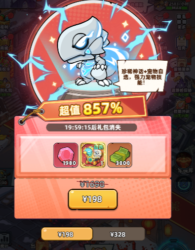 对比宠物转盘:想通过宠物转盘保底获取神话+宠物,通常需要“免费次数+钻石礼包+连续购买68元礼包2天”,总成本约为 (6+12+30+68)2 = 232米,本次直购价格为198米,比转盘保底便宜了34米~
