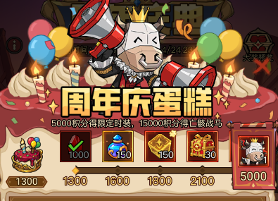 通过完成日常任务,可以获得蛋糕积分+周年金箱+暗金币,累计达到5000分可获得牛牛队长皮肤3件套、15000分可获得坐骑皮肤“亡骸战马”