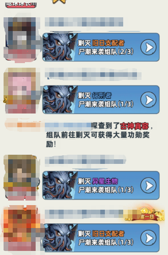 这次组队是可以随时退出的,所以可以等有人在频道发击退旧日支配者和古神真容后,再去使用自己的挑战次数,能把奖励最大化,也可以和联盟的人商量好,互相击退旧日支配者和古神真容~