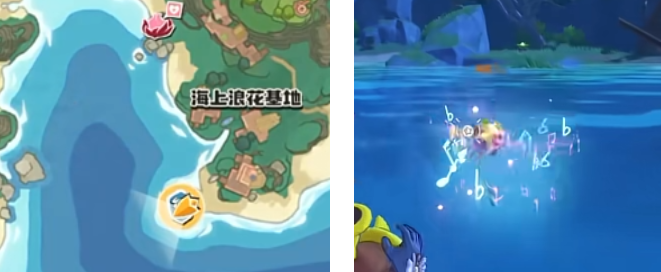 圆号鱼的位置在浪花基地的岸边,看到水中有号角在演奏就是他啦!