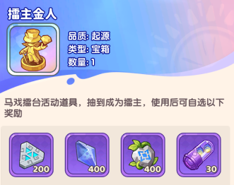 ① 当擂主:抽到擂主金人即可成为当期擂主,概率0.5%。当成为擂主之后,其他玩家抽取消耗钻石的一部分会成为擂主的收益,每轮擂主最高可以额外获取2000钻石,且该收益会随着重新抽到擂主金人而刷新