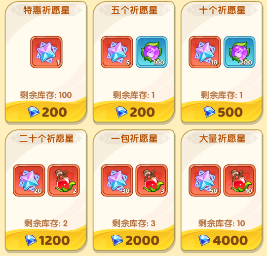 在这些卡池中,祈愿星可以使用钻石购买,价格依次分为200,500,1200,2000,4000这5个档位,随着价格不断升高,单个祈愿星购买的性价比也就越低。话虽如此,但还是建议大家能多买就多买,毕竟开区时间一旦到了39天,祈愿星就只能用200钻/氪金才能获取了