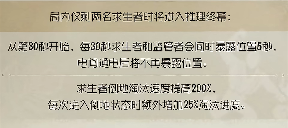 之前,场上剩余两个求生者时,系统会提示进入了终幕阶段,人屠双方将互相暴露位置,求生者倒地淘汰速度飞快。
