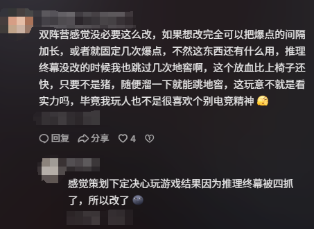 对此,有双玩家阵营表示,没必要这么改,可以把爆点时间间隔加长,或者固定几次,推理终幕这玩意不就是看实力嘛!