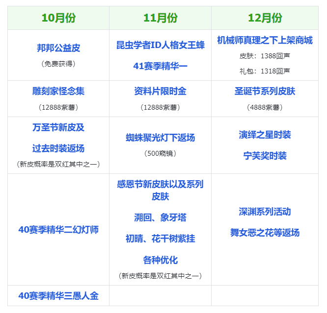 今年的秋日活动,目前只有预热。确定会返场小提琴家民谣乐手、邮差秋日随想,以及一些窥镜紫挂。但是小花猜测还有后半部分秋日活动,将会在7号、8号左右爆料。因为目前秋日金皮依然没有消息,那么上线只能排在新赛季上线的时候。