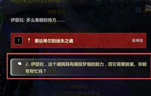 然后,与格温娜对话选择得到了材料,让她修复破碎的魂网。此时我们获得了修复的魂网。前往森林之心,如果你是法夜盟约,可直接找伊瑟拉对话,如果不是,则需要先找门口的卫兵,让他召唤出伊瑟拉,然后与之对话,获取道具<捕梦网>。