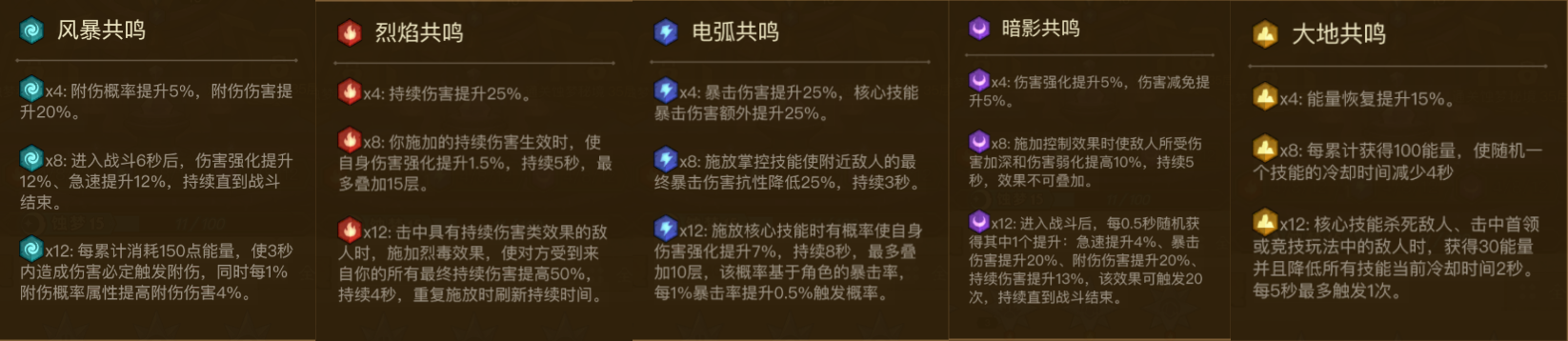 一个刻印分为三个部分:技能+元素+属性!大家在挑选刻印时,一定技能效果=元素>属性!千万不能搞错,这一步错了,后续再怎么选都是白搭。而且从下图可以发现,一个刻印随着等级的提升会解锁多个元素,所以到了后期,我们也需要根据元素共鸣去搭配刻印!各元素共鸣适用场景,小洛也列出来了,往下看!