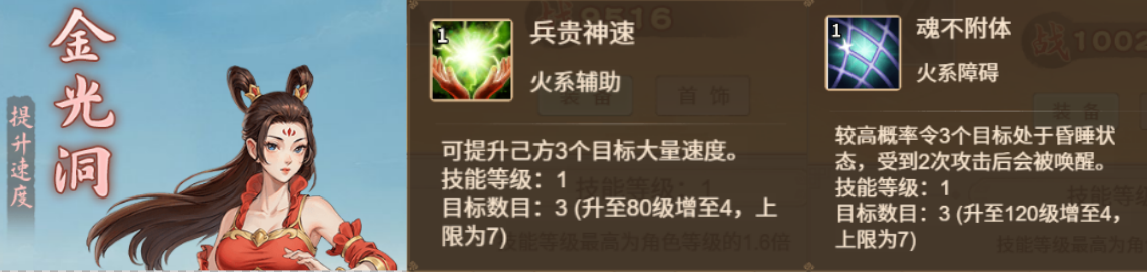 火系角色的辅助技能为提升速度,障碍是昏睡,也就是多宝道人+汉钟离。除了前期对速度和昏睡的需求不大外,后期速度就会变得越来越重要,而昏睡也是刷道的重要组件,所以火系也是中后期的最优选择。