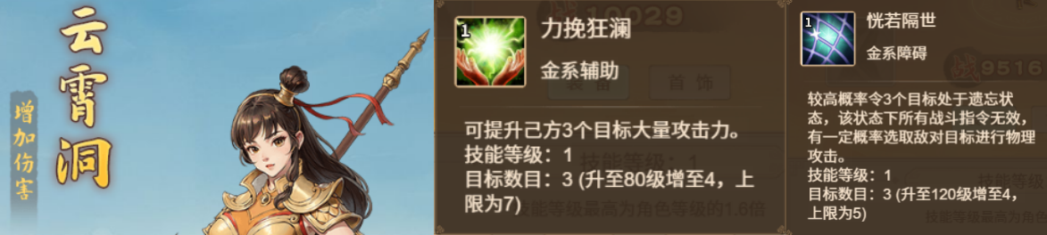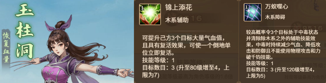 木系角色的辅助技能为回血和复活,障碍是中毒加驱散,也就是强化版九天玄女+强化版幽天君。因为可以替代奶妈,能省下一个位置组成全输出的阵容,在前期各类挑战中表现不错,但后期较弱,只适合开局选择。