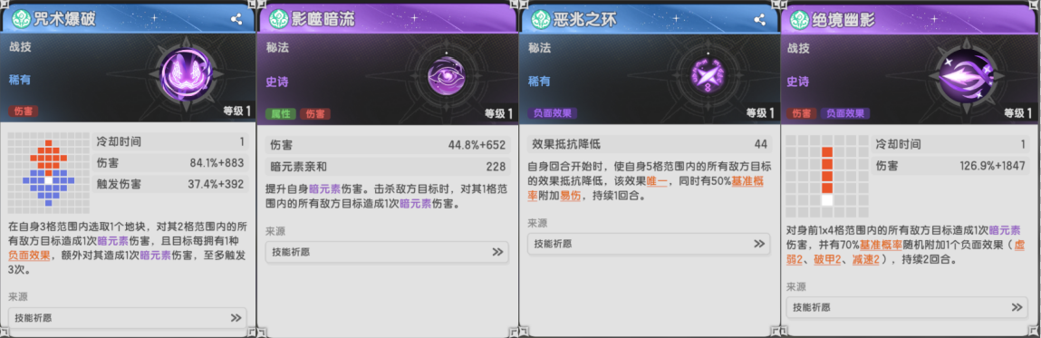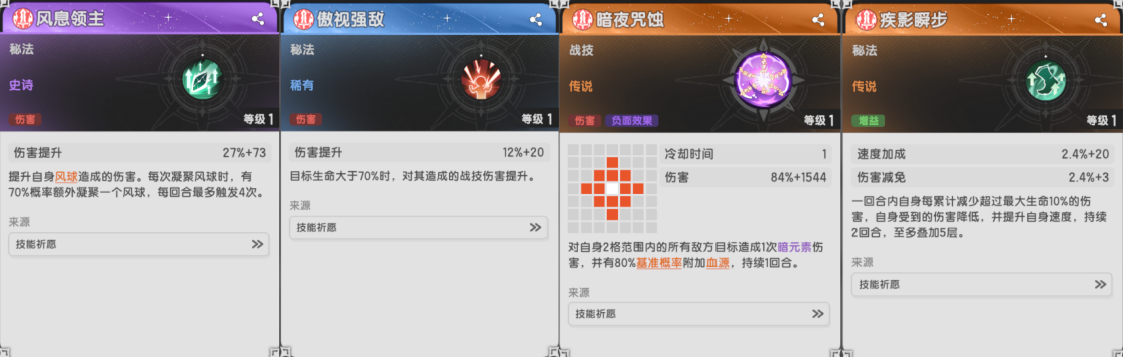 风息用于风系增伤,傲视和瞬影则绑定在PVE与PVP,暗夜咒蚀用来补生存,基本上使用场景较窄。