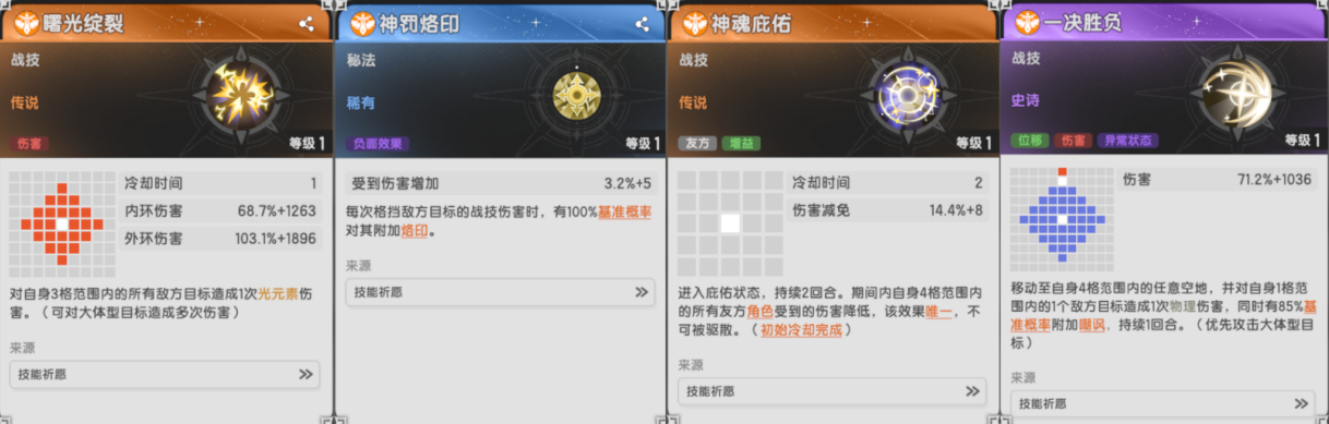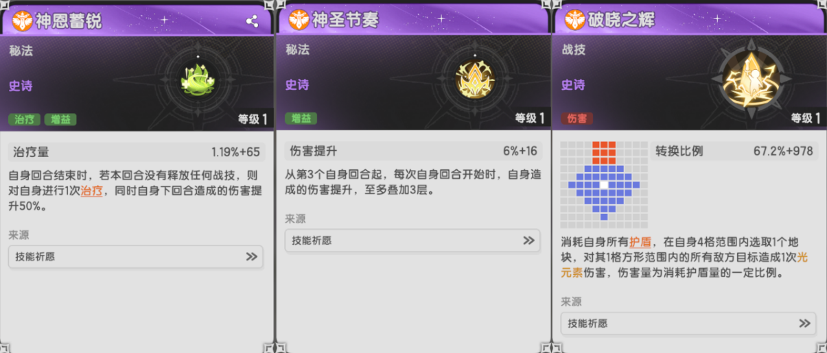 神圣节奏着眼于长线战斗,神恩锐蓄对轴对的好效果也相当不错,而破晓之辉虽然不复往日荣光,但依旧也能用。