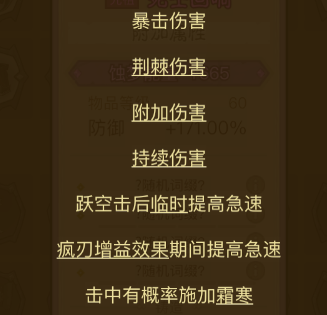 5~6词条首选暴击伤害、霜寒;次选持续伤害(火刀专属)、跃空击急速(毁灭)、灵光一现、灵巧步伐