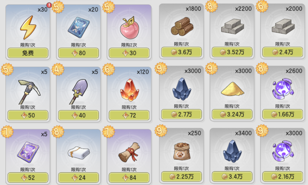 家园商店一般都是全买,晨星商店的折扣很高,而金币商店则是我们补充素材的重要手段。如果缺少晨星,可以考虑不买苹果、精锻石、委托卷轴,但女神牌和秘境开采是一定要买的!要是金币紧张,也可以跳过没打折的非急需资源~