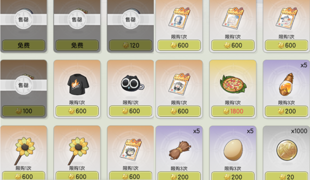 除了必拿的转盘券和盲盒币,一定要把幻装全换完,用不上的也要换!(说不定以后想转职了呢)。剩下的道具中优先换金色料理(如果你没吃过),再换养成素材,最后才是不提升任何战力的表情包。实际上宝子们也不用纠结,只要正常参与活动,绝对是能搬空商店的~