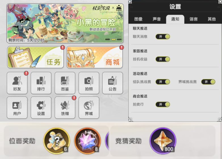 点击菜单的“设置”按钮,就可以开启挑战赛推送!可别觉得这是给自己增加垃圾信息,竞猜时可是要本人上线的!要是错过了挑战赛时间,就会少拿很多晨星(如果猜的准),小乐建议大家把挑战赛都打开!