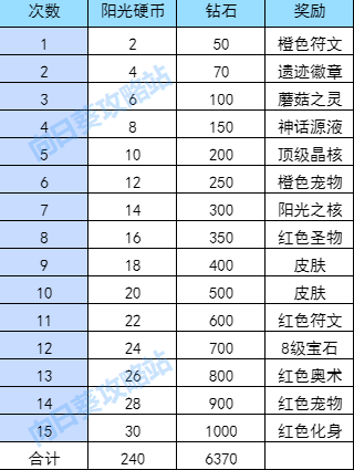 那么该活动的玩法逻辑是什么呢?这里小葵给大家快速总结一下:活动期间,每充值30米可换阳光硬币,抽奖需消耗大量硬币+钻石。经过计算,拉满一轮奖励共需要充值7.2k大米,并花费6370钻石,下图为统计表,大家自行参考