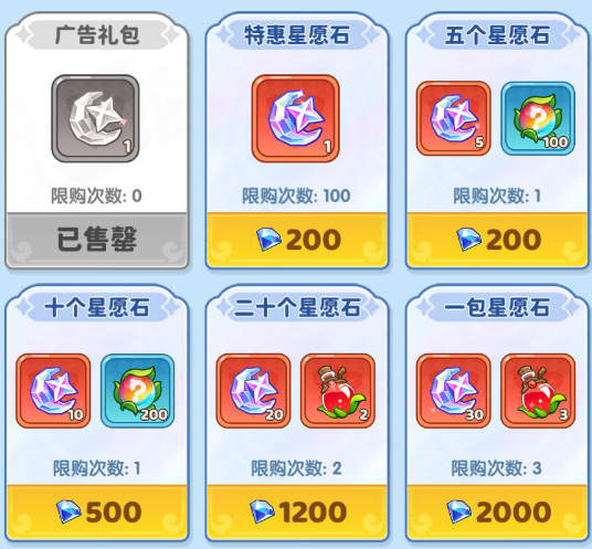 ② 玩法详解:该玩法的核心道具为星愿石,礼包价格和新区的钻石祈愿星完全一致,购买200-2000钻所有礼包,花费9.1k钻可得145个星愿石