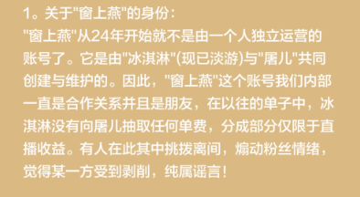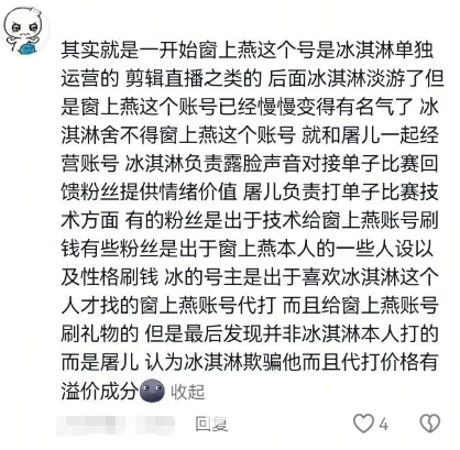 后来到了2025年中,屠儿觉得自己太亏了。直播要被平台抽成、扣税,还要给冰淇淋分走一部分,到手的钱也没多少;加上他觉得有人想抢自己的活儿,对“窗上燕”这个IP的控制权越来越焦虑,身体和情绪的吐槽还被传到了圈里,暗流开始发酵。后面去年年底,屠儿的吐槽终于被网络公开了,圈里就开始传窗上燕是假的,屠儿只是代打,冰淇淋压榨屠儿等等传言。。。