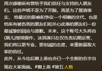 不过他们也承认,一开始没坦诚账号是双人运营的事是错的。早期冰淇淋出声圈了不少粉,他们怕颠覆大家的认知引发舆论危机,就一直将错就错,现在特别后悔,向所有受伤害的粉丝郑重道歉。尤其是对 “冰” 账号的号主面团(起因中控诉窗上燕退钱的粉丝),他们深感愧疚,说面团是受伤害最大的,已经私下沟通好补偿方案,达成和解且开始执行了,还专门向面团诚恳道歉,说辜负了人家的真心支持。