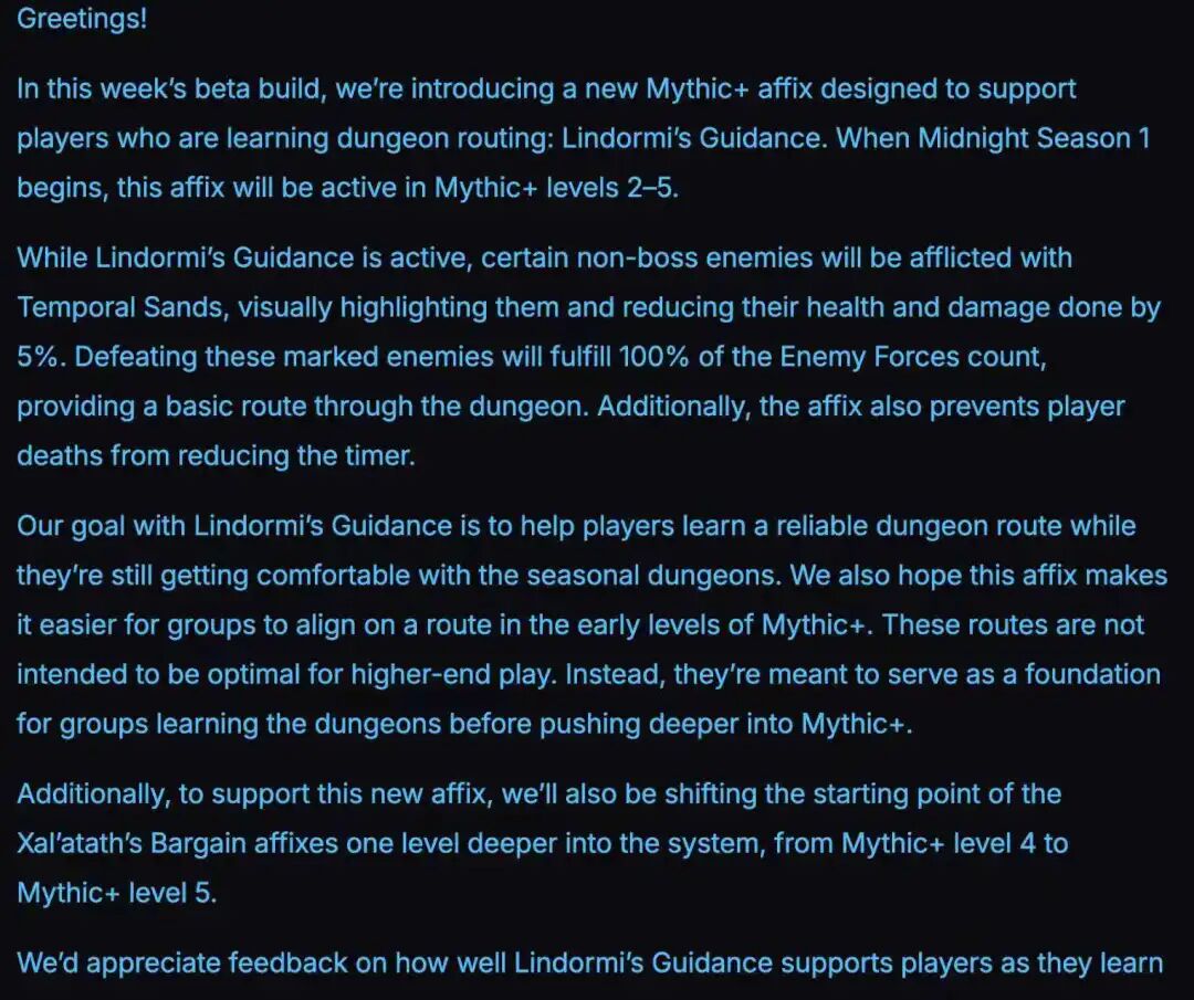 同样还是在本次的ptr更新中,暴雪引入了一个全新的词缀,专门针对那些正在学习地下城路线的玩家,词缀名称为“林多尔米的指引”,在2-5层中生效。