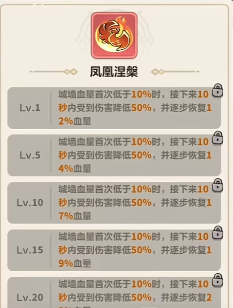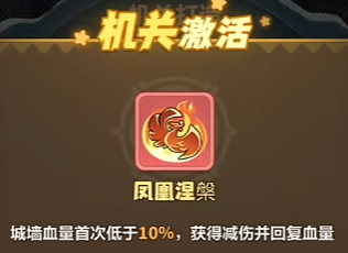 先带大家看下凤凰涅槃“最初版”的技能效果,核心机制是城墙血量首次低于10%时,减伤50%,逐步恢复少量血量。照本兔来看,这个机关的效果非常拉跨,都不用正式落地就可以确定,它没有SOS好用!!