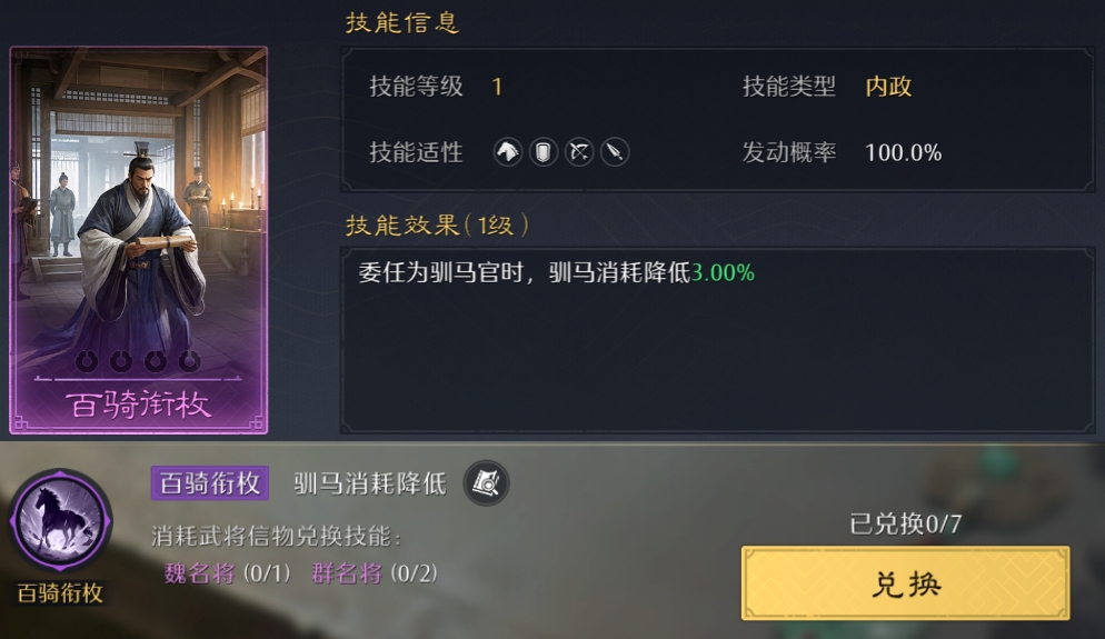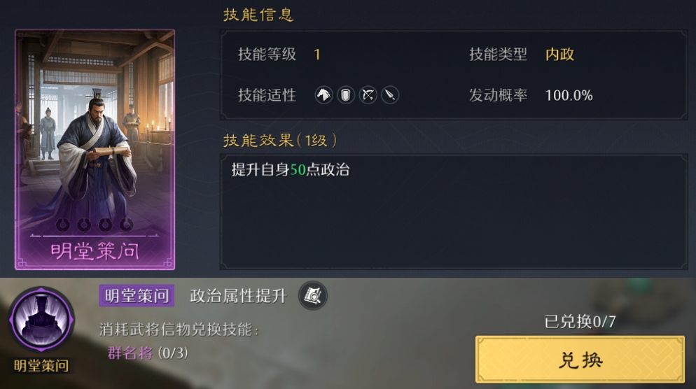 提升大量政治属性,最强内政技能,必须优先换满!