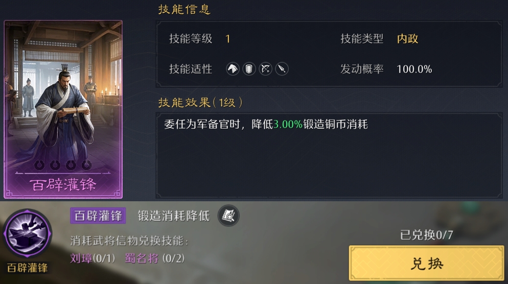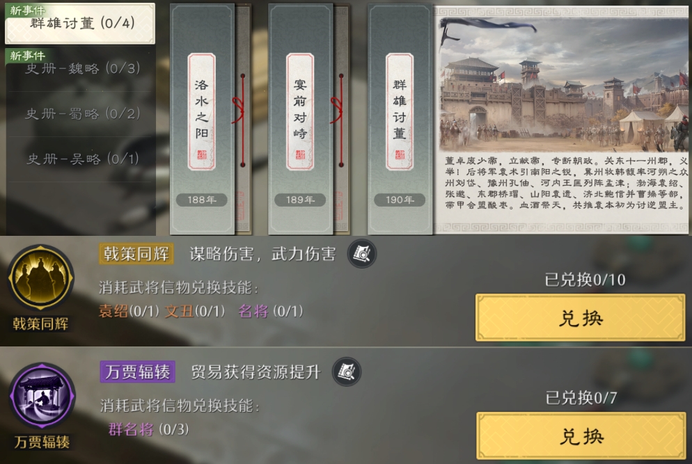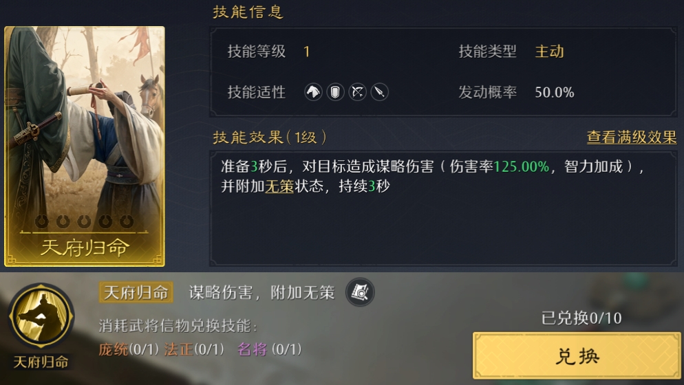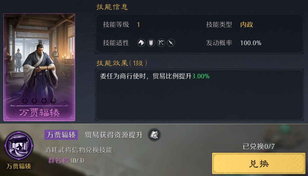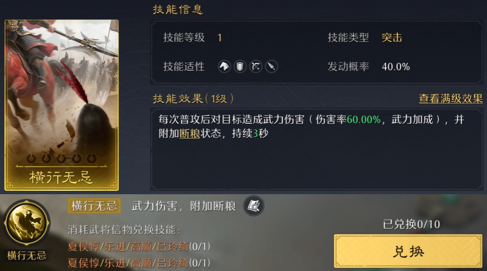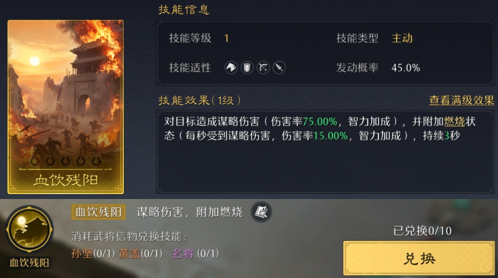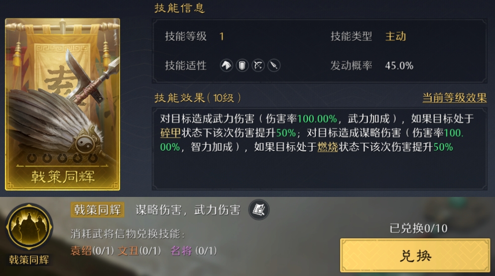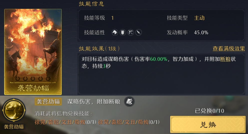 在技能界面右上角点开史册技能,可以看到10个历史篇章及对应的技能!其中金色战斗技能可以换10个,紫色内政技能可以换7个,都刚好能升到满阶!但对信物的消耗极大,金色技能估计只有满红大佬能拉满了~
