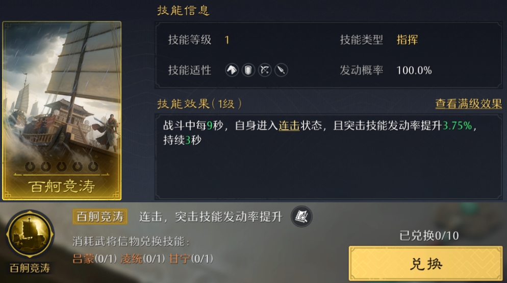 非常少见的指挥连击技能!这下连击队武将也能跳堡了!还能提升突击技能发动率,在短时作战中优势明显!给常规的连击武将携带也很不错~可惜兑换的成本太高了...