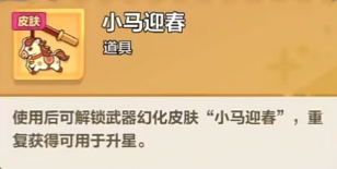 ③ 武器:签到7天可得金武“小马迎春”,1星效果为局内强化≥4,所有英雄伤害+8%;5星效果为局内强化≥2,所有英雄伤害+18%