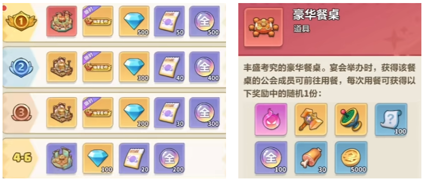公会排行榜的核心奖励为餐桌,获取后可以在公会举办宴会,参与的成员可以随机获得奖励,最好的“豪华餐桌”可以产出粉色元神,算是个给大佬提高公会互动度的添头叭~