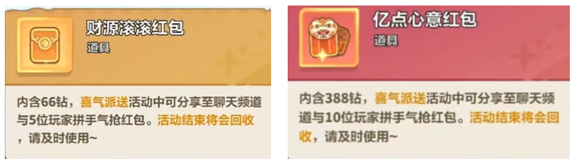 ① 红包:签到4天可得小红包(内含66钻石)、12天可得大红包(内含388钻石),可将该红包发放至聊天框和其他玩家拼抢,算是个增加互动、白嫖钻石的免费福利了