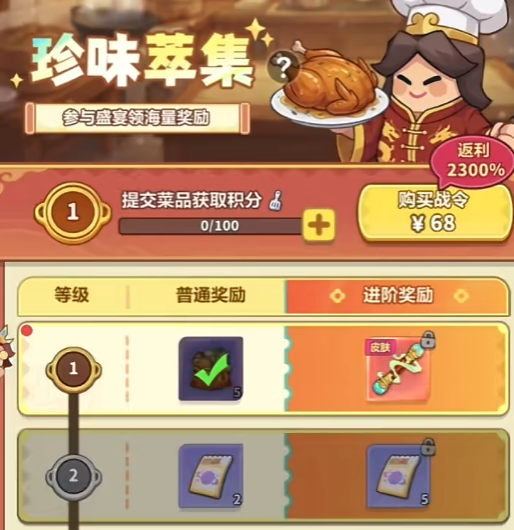 活动核心玩法“盛宴筹备”,需要提交所需菜品、获得积分,以提高战令等级