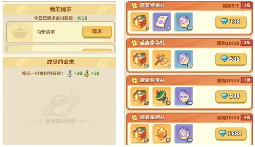 除了任务之外,也可以用钻石购买万能材料礼包(自选获得食材),或向公会成员求助,每天最高可得10个食材哦