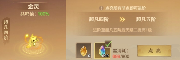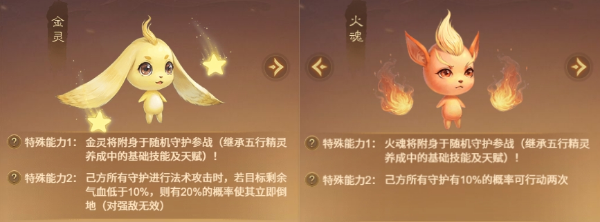 选能力的原则是“有金选金,没金选火”,两个都没有,则从木、水中择优选用。在金火到达7级后,如果刷出的能力不好,则优先点出3级/7级的木灵和水灵,获取附身后的技能和天赋效果~