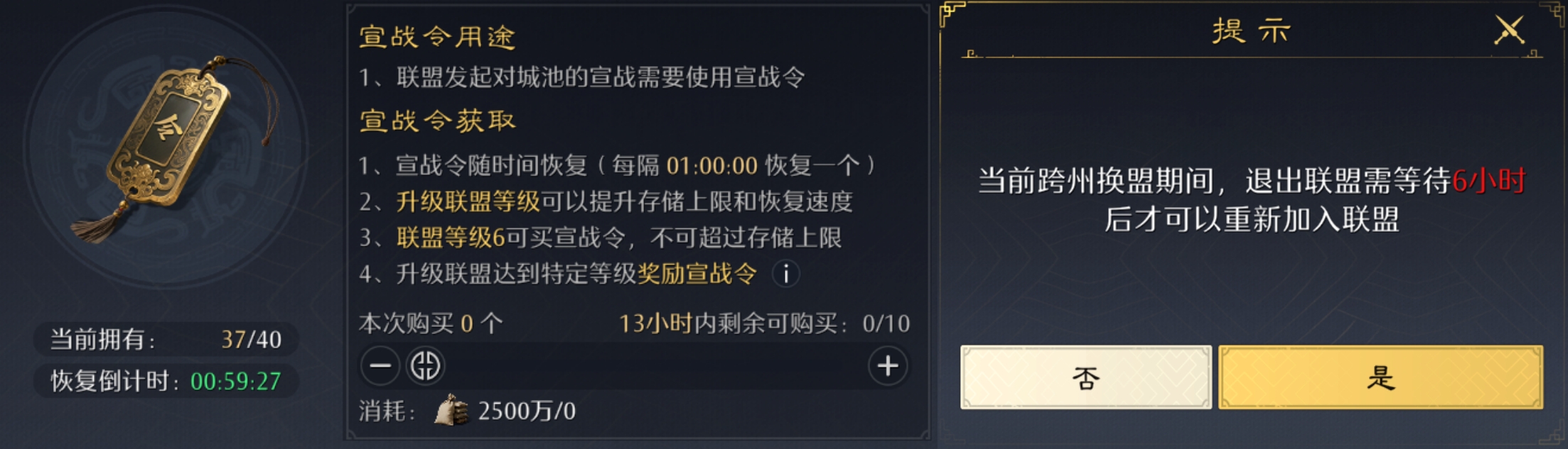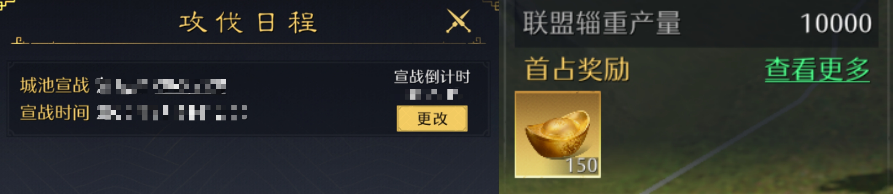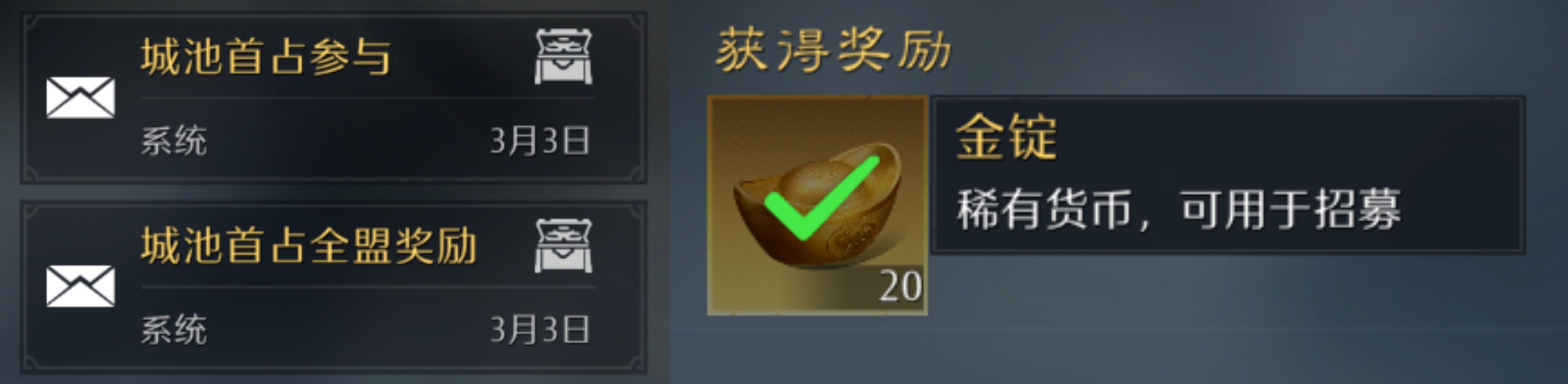 如图所示,首占白城可以获取大量金锭!而宣战令虽然数量有限,但却是可以存的!这就为吃满全城提供了理论可能!具体做法是:在当前联盟的宣战令用完后(包括购买的和奖励的),立即转投下一个满令联盟,然后如此循环往复,就能吃满攻城赏金~
