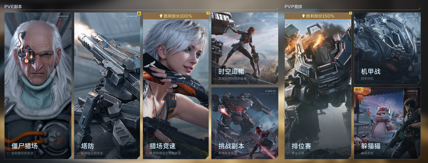 小编从开服就有个感觉:游戏内容像是“精简版”。无论是猎场、塔防还是PVP,现有的体量都撑不起长线体验,猎场开服至今仅 5张,且老图(如大都会)的分支路线等内容都有删减,塔防则只有 3张,模式比较单一,至于时空追猎就 2张,玩法深度有限,最后的机甲战活跃度很低,小编打匹配到的经常是人机。